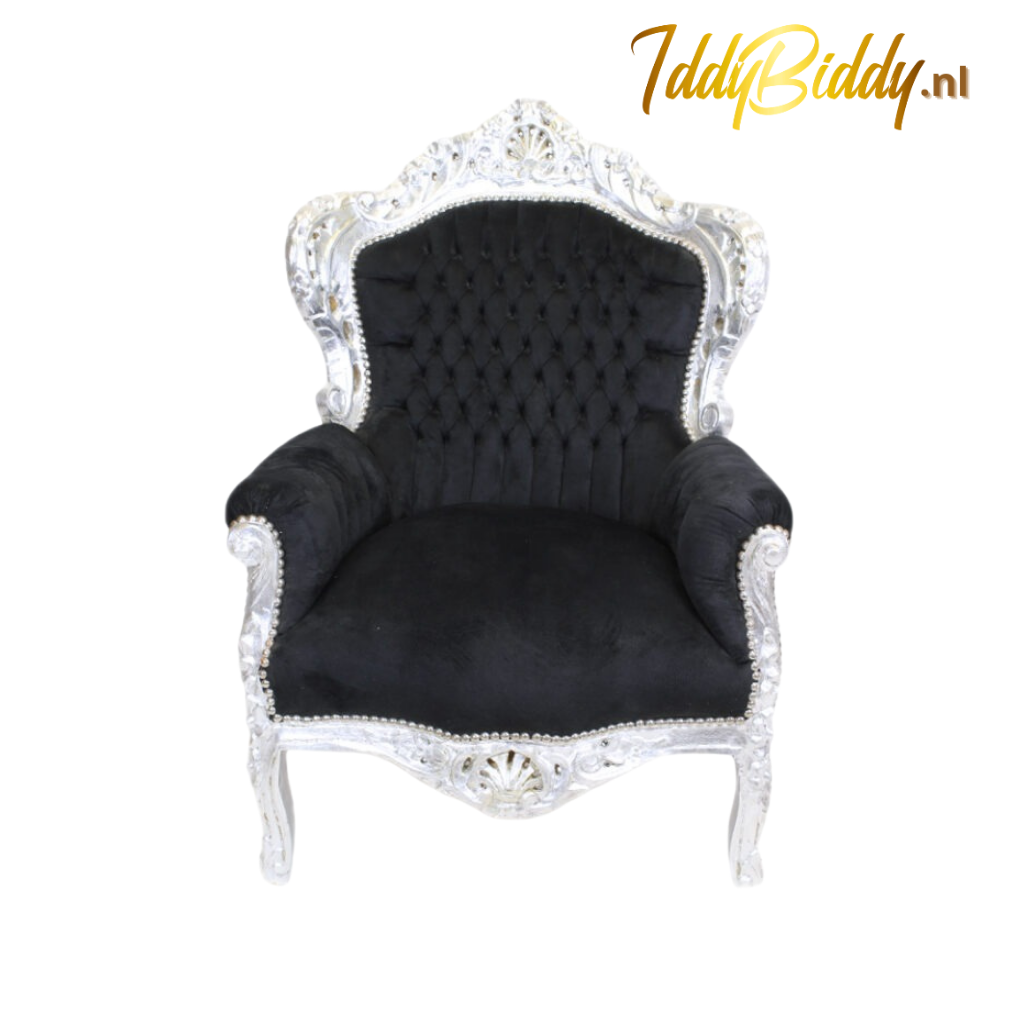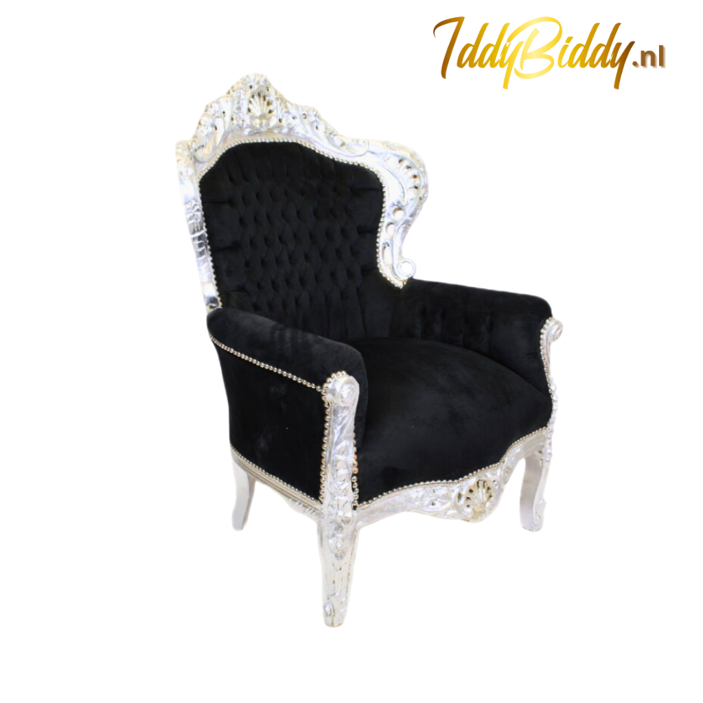 Zwart-zilveren barok stoel met fluwelen bekleding. Met deze stoel gooit u geheid hoge ogen.